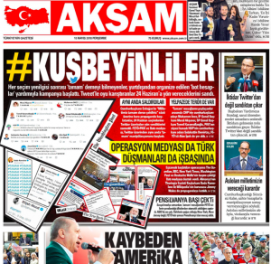 AKP’ye yakınlığıyla bilinen Akşam gazetesi, bugün konuya ilişkin “Kuş beyinliler” manşeti attı.Gazete, AKP’nin “devam” mesajını bot hesaplarla yaymaya çalışırken yakalandığını ve binlerce mesajın silindiğini görmezden gelirken, yine bot hesap yalanına sarıldı: