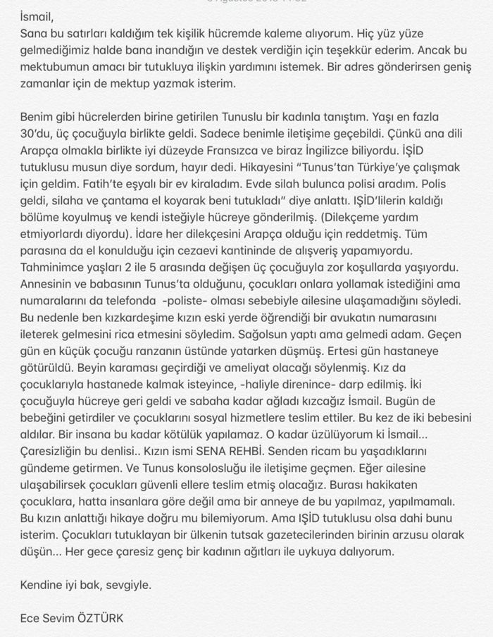 Mektubunda 2-5 yaşlarındaki 3 çocuğun cezaevinde zor şartar altında yaşadığını, sonra bu çocuklarını sosyal hizmetlere teslim edildiğini anlatan Öztürk, “Senden ricam bu yaşadıklarını gündeme getirmen. Ve Tunus konsolosluğu ile iletişime geçmen. Eğer ailesine ulaşabilirsek çocuklarını güvenli ellere teslim etmiş olacağız. Burası hakikaten çocuklara, hatta insanlara göre değil ama bir anneye de bu yapılmaz, yapılmamalı. Bu kızın anlattığı hikaye doğru mu bilemiyorum. Ama IŞİD tutuklusu olsa dahi bunu isterim. Çocukları tutuklayan bir ülkenin tutsak gazetecilerinden birinin arzusu olarak düşün…Her gece çaresiz genç bir kadının ağıtları ile uykuya dalıyorum.” dedi.